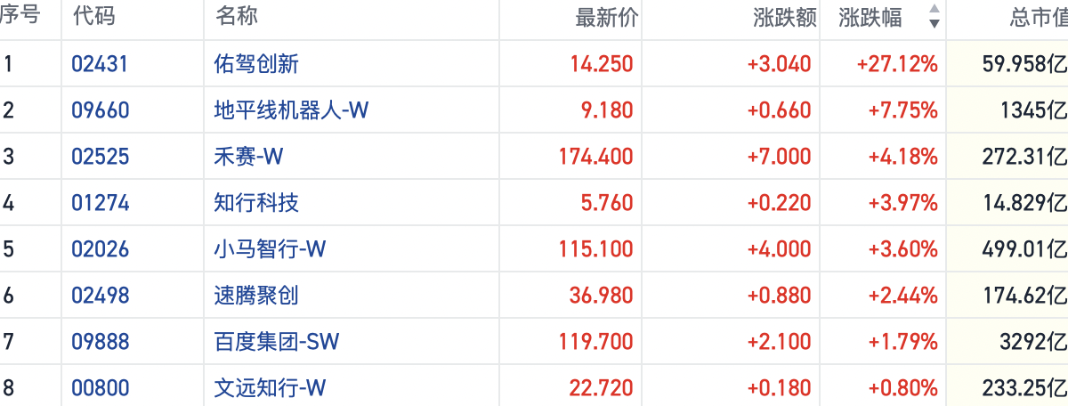 截至发稿,佑驾创新(02431.HK)今日最高一度涨超30%,地平线机器人-W(09660.HK)涨逾7%。此外,小马智行-W(02026.HK)等多只个股也明显跟涨。